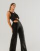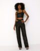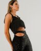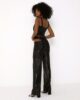 Calça paetê flare com recortes vazados nas laterais, cintura alta, fechamento em zíper na região de trás, possui forro interno