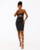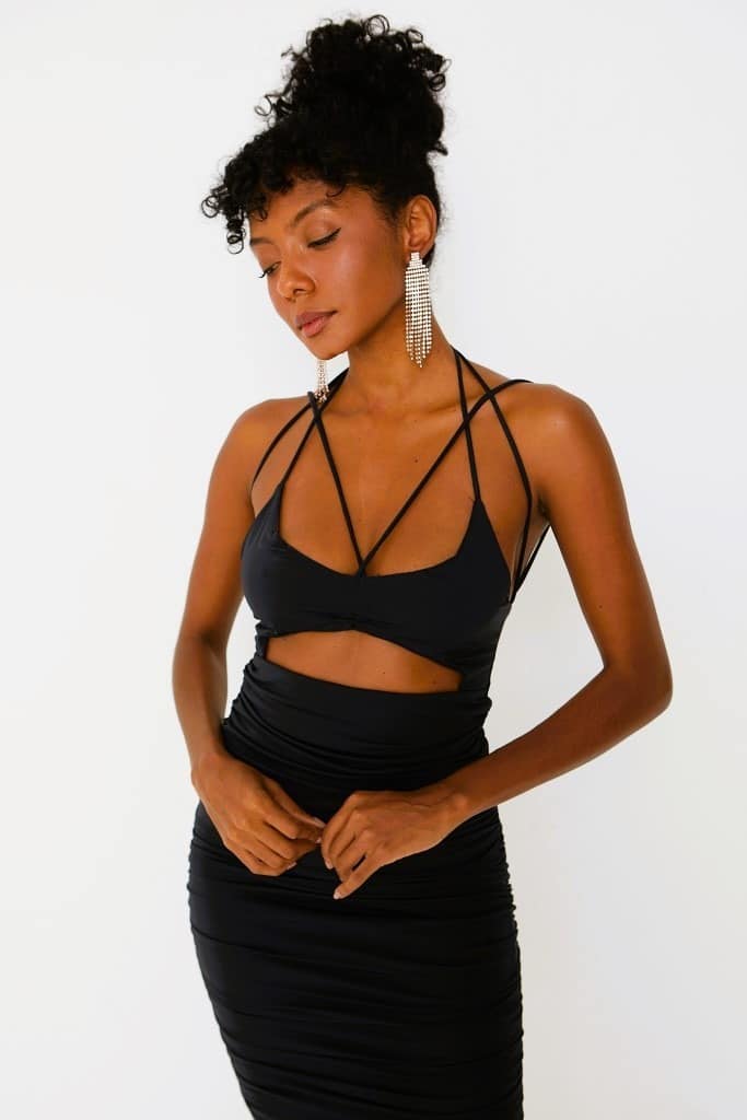 Confeccionado em malha, estampa preto poá, alças trançadas, recortes vazados em seu busto, já seu comprimento traz amplitude quando associado aos drapeados da saia, o que agrega volume sem perder a sutileza, e com forro interno