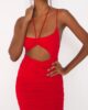 Confeccionado em malha, estampa preto poá, alças trançadas, recortes vazados em seu busto, já seu comprimento traz amplitude quando associado aos drapeados da saia, o que agrega volume sem perder a sutileza, e com forro interno.